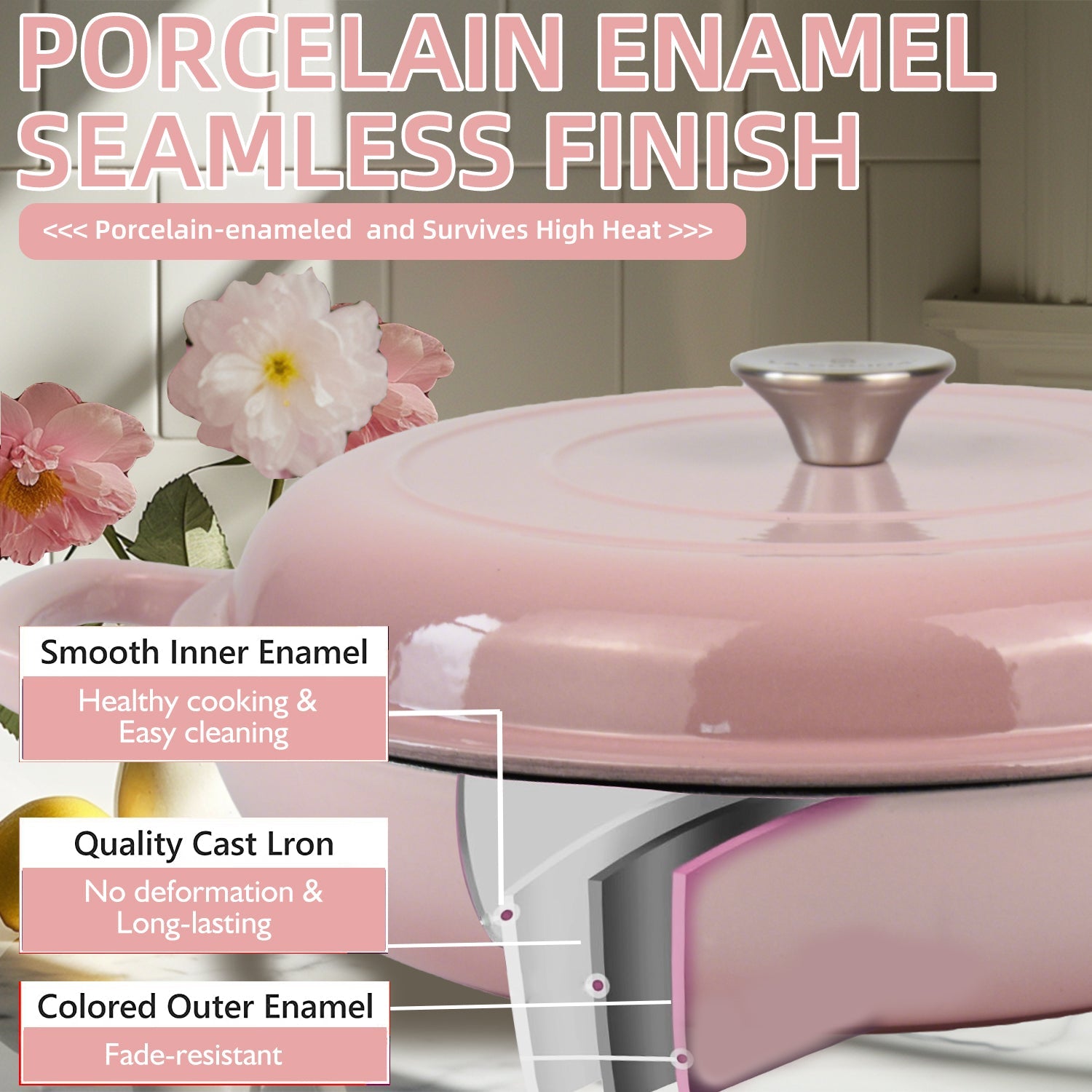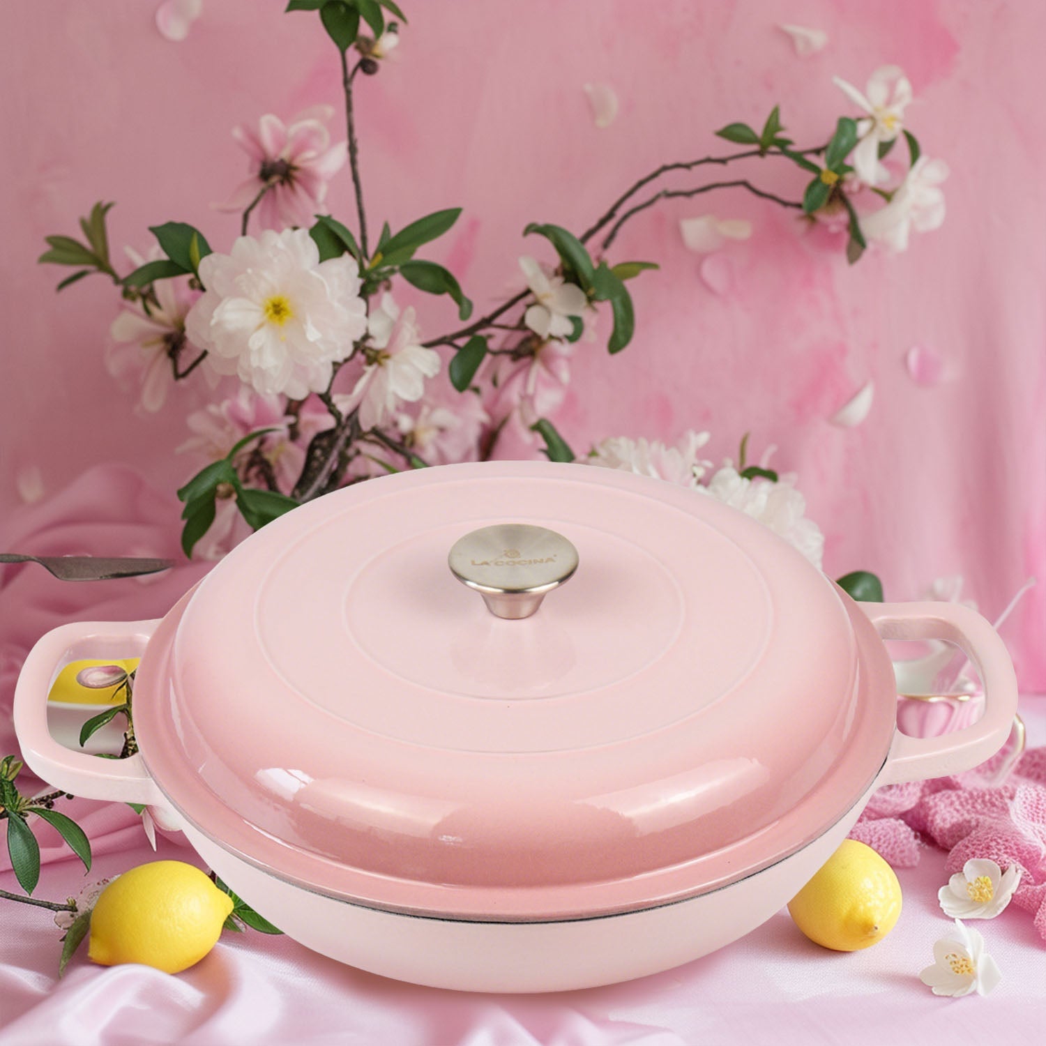 La Cocina 30cm Ombre Pink Cast Iron Shallow Round Casserole Paella Pot - 3.5 Liter